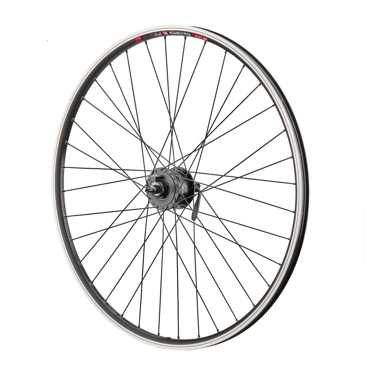 Rose custom-made front wheel for hybrid / ATB bikes with rim brake or disc brake (disc or not) and hub dynamo consisting of: