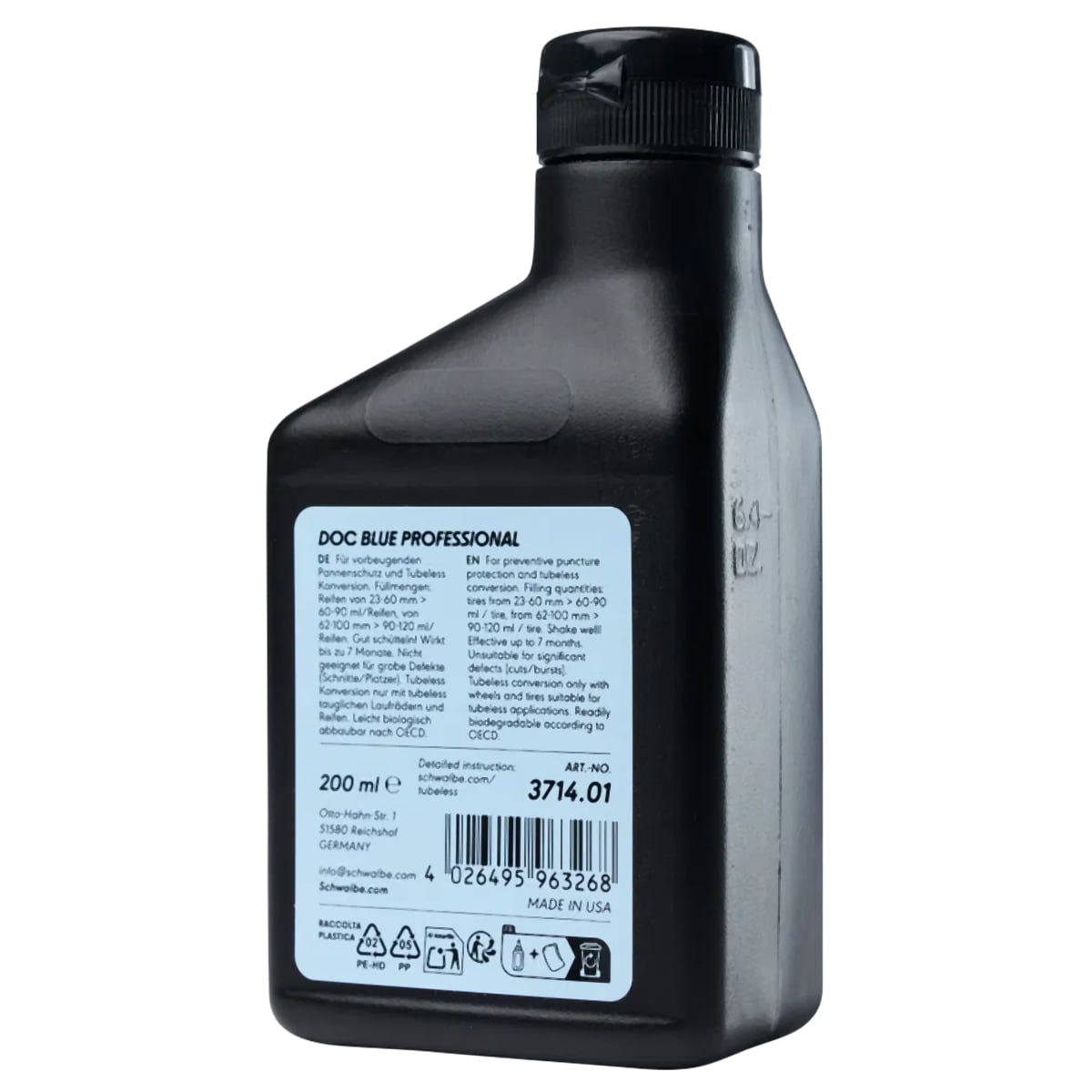 Schwalbe Doc Blue Professional is a latex-based sealant for tubeless systems, bicycle tubes and tubular tyres.