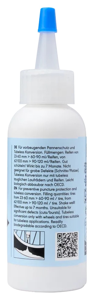 It is distributed in the tyre or inner tube and reliably seals holes, punctures and small tears up to a size of approx. 6 mm during the ride. This keeps the system airtight and you can continue your journey.