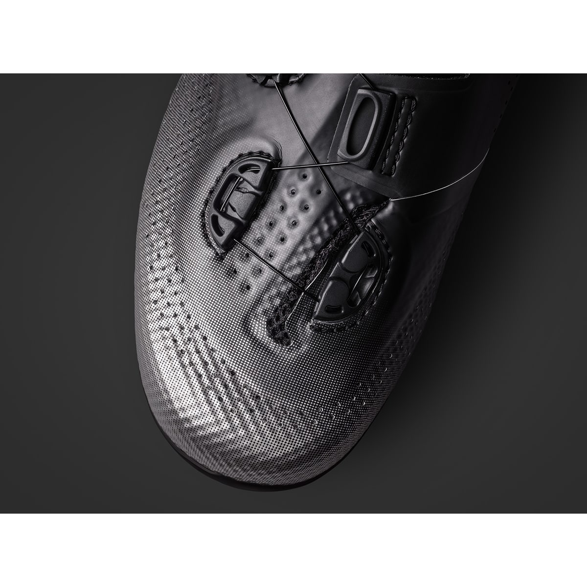 A closure system consisting of dials and stainless steel wires that allow for precise adjustments. This combination allows cyclists to even adjust the shoes while riding. As there are no Velcro straps, the front part of the shoe is well-ventilated. The shoe can be closed by pushing and turning the dial in the direction of travel. The laces loosen by pulling the dial.