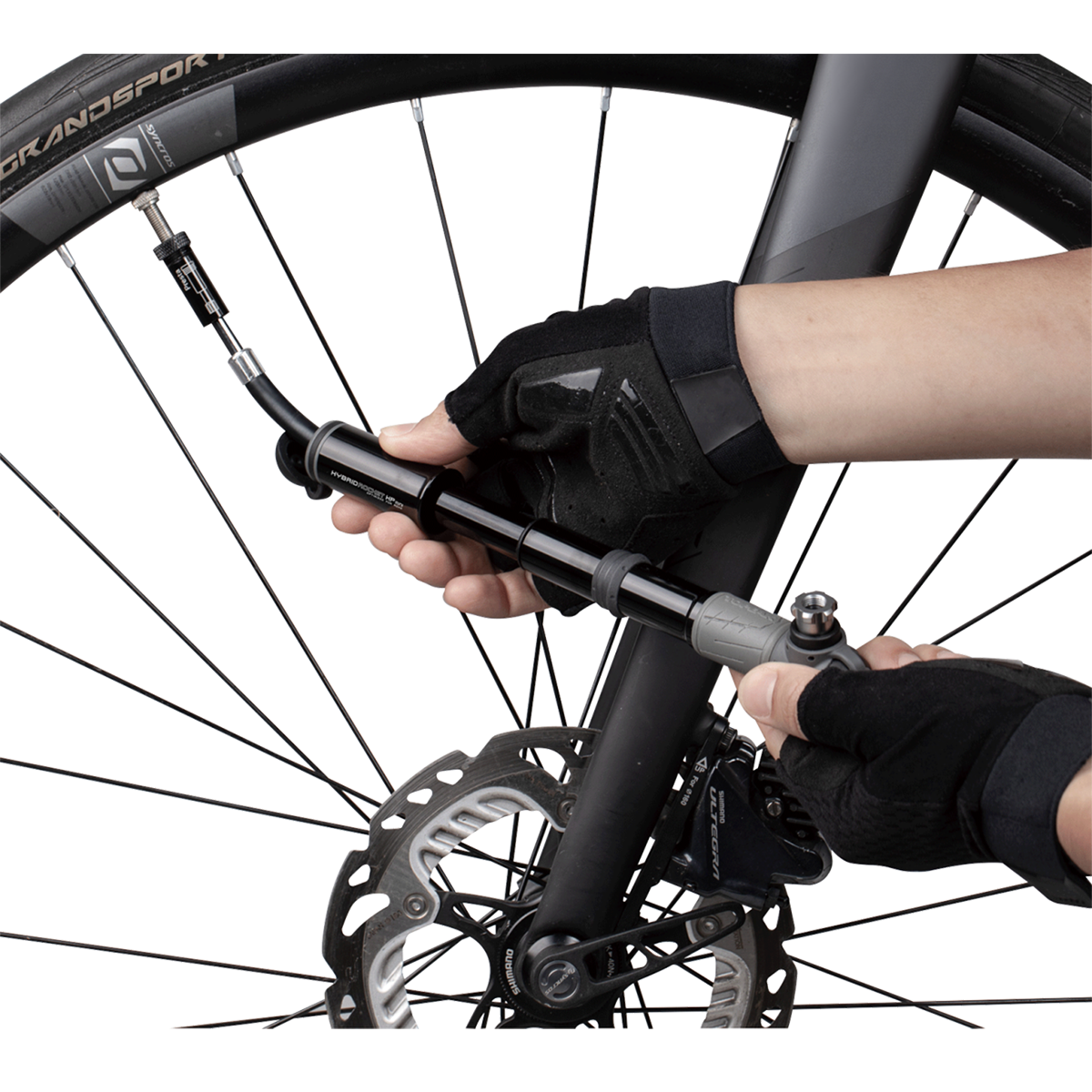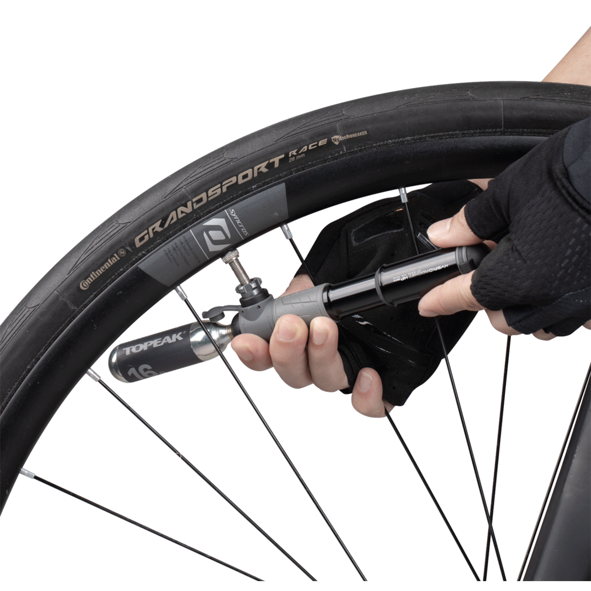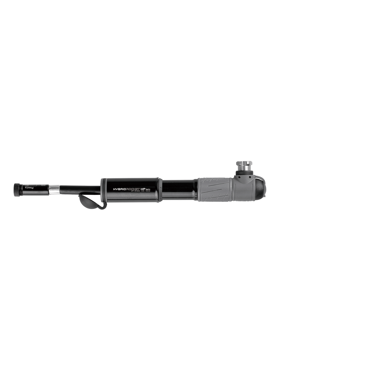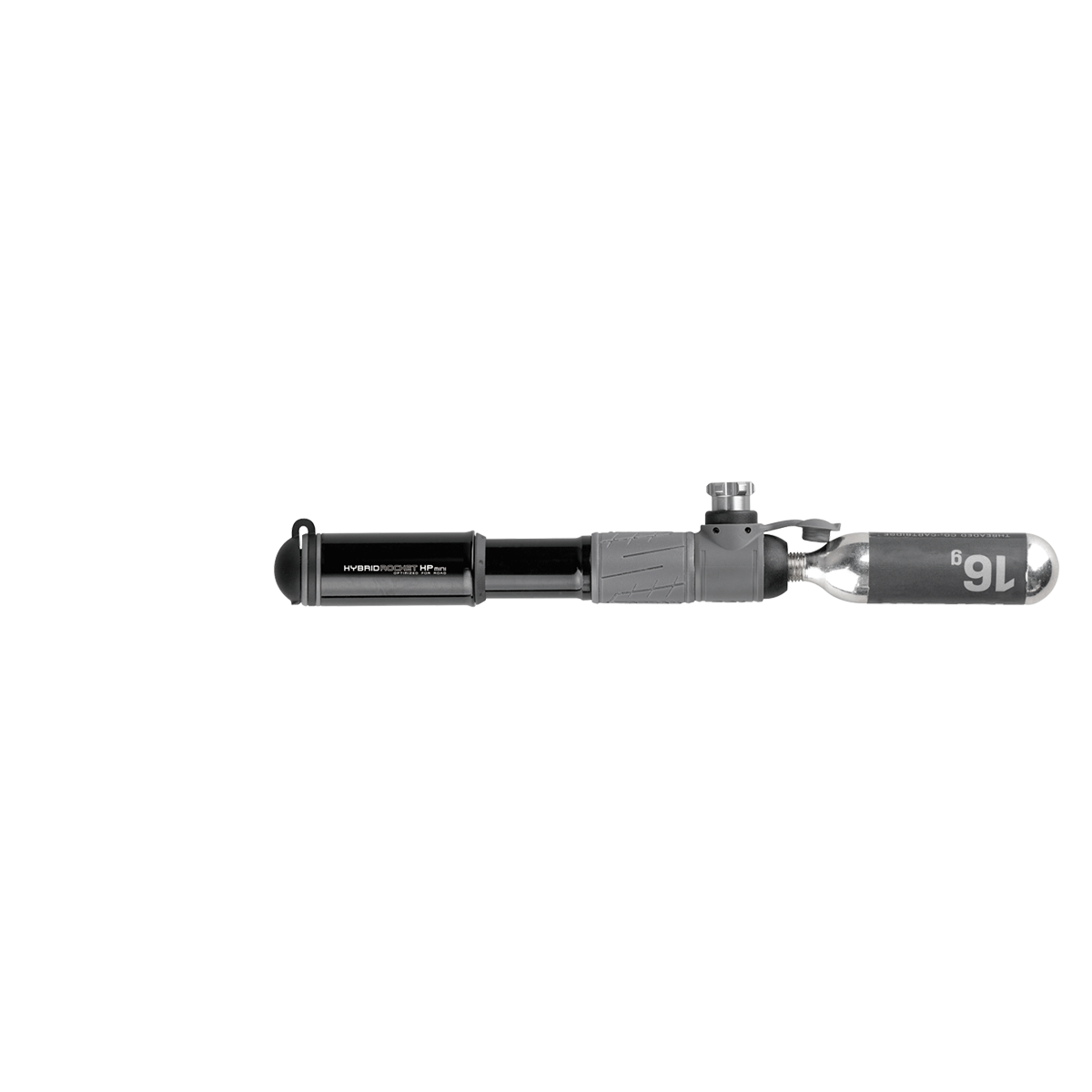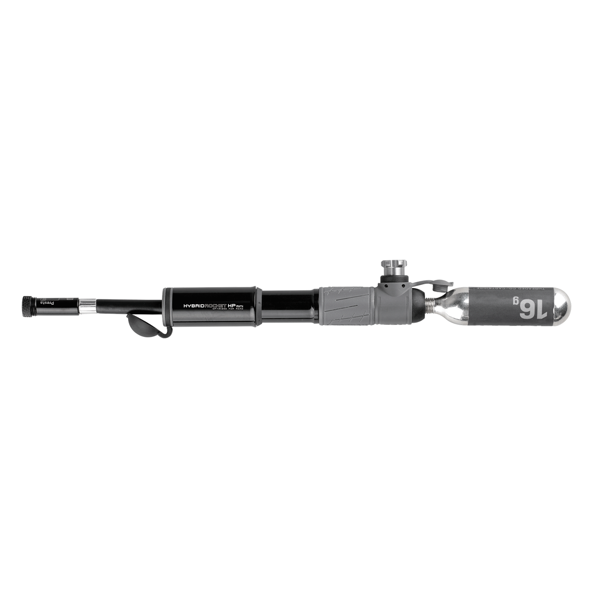 Mini pump, CO₂ inflator or both? The choice is yours! Topeak’s HybridRocket HP Mini combines the reliability of a mini pump with the rapid tyre filling ability of a CO₂ inflator in a compact housing. The CNC machined aluminium barrel is optimised for high pressure and inflates up to 160 psi / 11 bars maximum pressure. An extendable hose can be used for convenient manual tyre inflation. SmartHead™ ThreadLock pump head accepts Presta and Schrader valves. The integrated PCT cap can be used to replace Presta valve cores.
