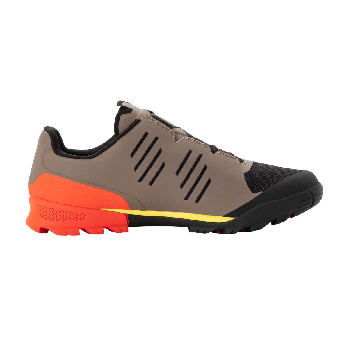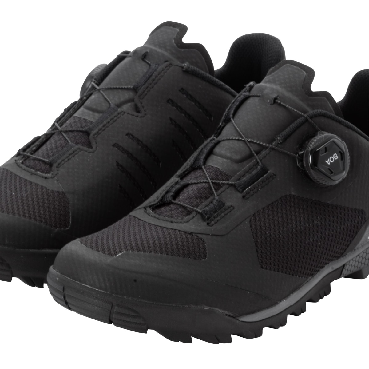The dynamic tread pattern provides a larger contact area and good abrasion resistance. The bolt-on cover of the cleat system allows you to either ride with or without cleats. A nylon reinforcement ensures best power transfer to the pedal. The sole is convex for easy walking. Besides, it offers high shock absorption on midfoot and instep.