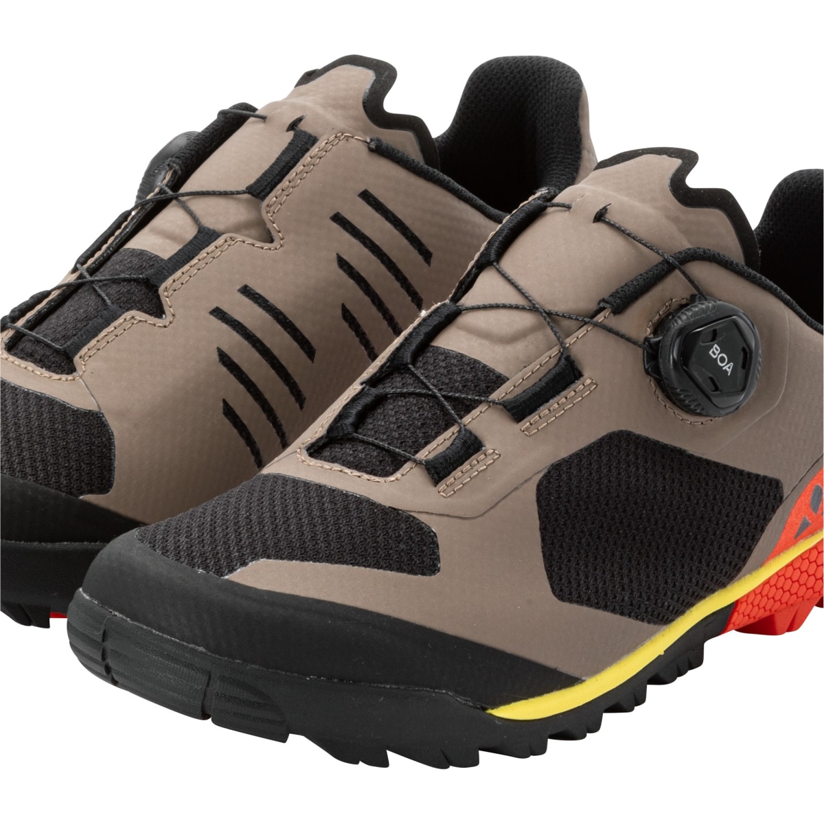High-tech bike shoes for all-mountain use: The DOWNIEVIELLE TECH II cycling shoes from VAUDE are true trail experts. Selected performance material and strategically placed features ensure a high-quality combination of grip in walking passages, ideal power transfer to the pedals, high wearing comfort and durability. Above all, the robust VAUDE AM SOLE with its FLOW INDEX 6 stiffness index and nylon reinforcement provides the ideal basis for fast enduro tours. Thanks to the clipless pedal system, you are always in contact with the pedal! The BOA L6 dial provides optimum fine adjustment in terms of fit and can also be conveniently operated with one hand – in case you need to move quickly.