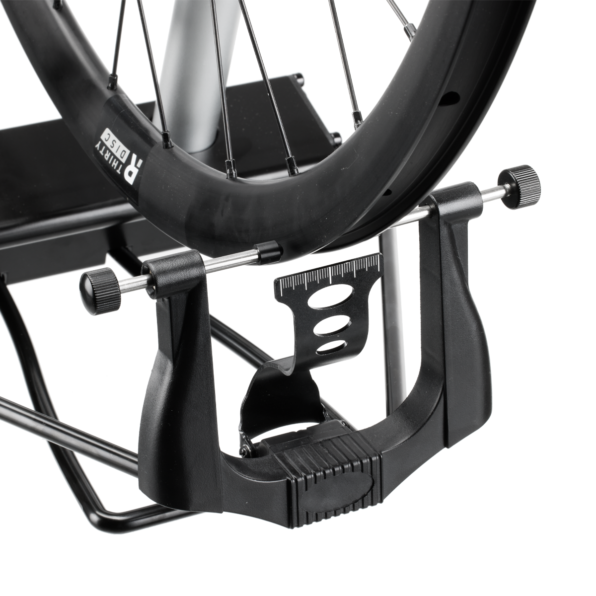 High-end centering device for daily workshop use or occasional use at home. Its large ground contact area gives the 2-Zent.A: a secure hold on workbenches, tables or out and about in the boot of the car. Its torsional rigidity achieves a maximum level of accuracy and continuously variable quick adjustment makes adjustment to any hub width possible without any difficulty. The ROSE "2-Zent.A:" is precise and easy to operate. Radial and lateral run-out can be centered at the same time. The variable folding mechanism makes it small and easy to transport.