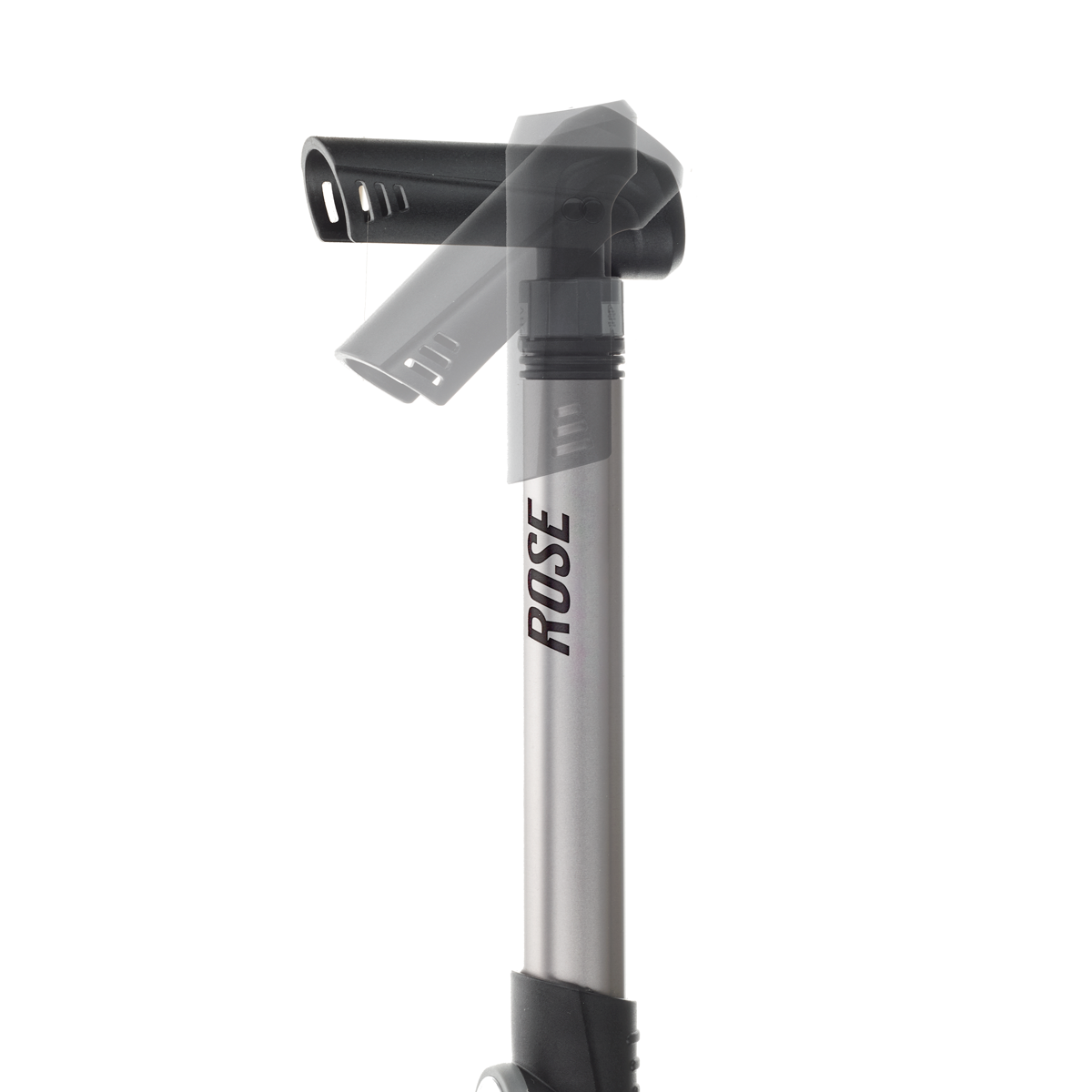 Plenty of pressure or plenty of volume? By turning the HP/HV cuff, you can switch the ROSE airik MT mini pump between a high-volume and a high-pressure setting. Its Clever-Valve pump head accepts Presta and Schrader valves and secures them with a clamp lever.