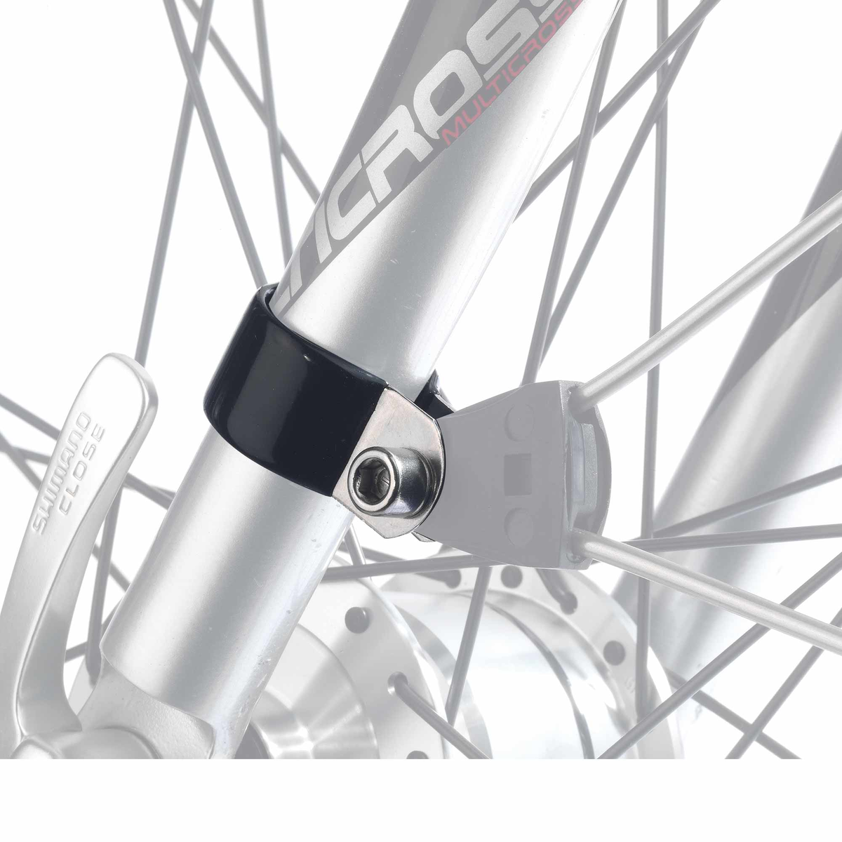 Plastic-coated clamp to mount e.g. pannier racks or mudguard stays on frames without eyelets.