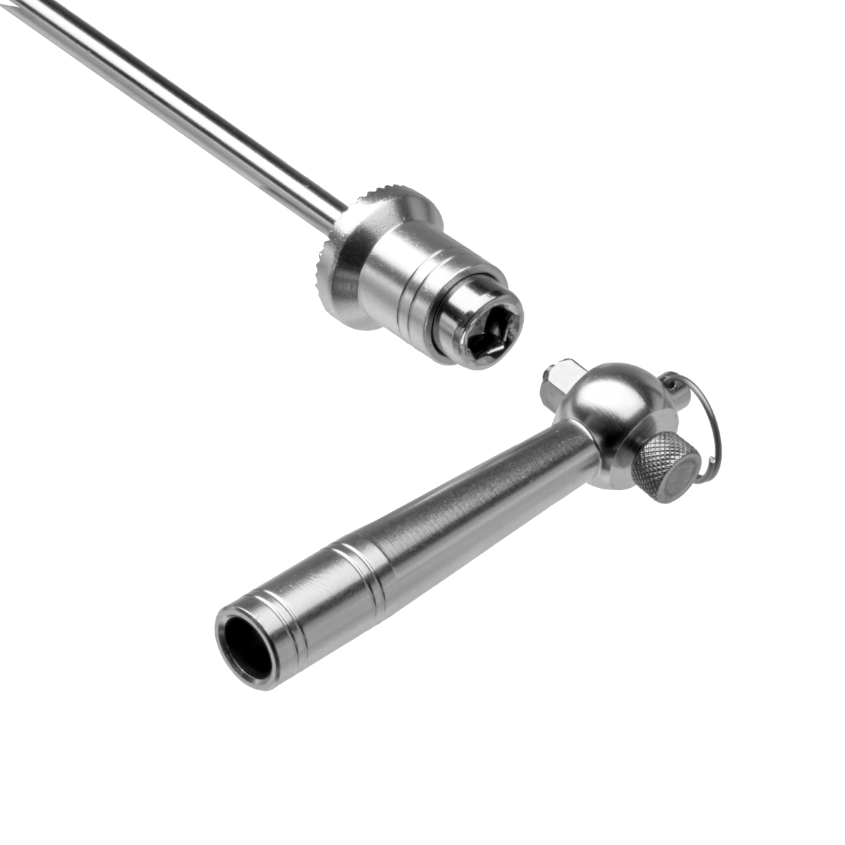 Unfortunately, the unsecured attachments can also be dismantled just as quickly if left unattended. The ROSE skewers set with special key lock helps to prevent theft! The protected internal screw connection of the axles is tightened with the enclosed internal pentagon spanner to secure it. The spanner head can be fixed in the axle mount with a knurled screw to prevent it from slipping, so that higher forces can be exerted when tightening or loosening.
